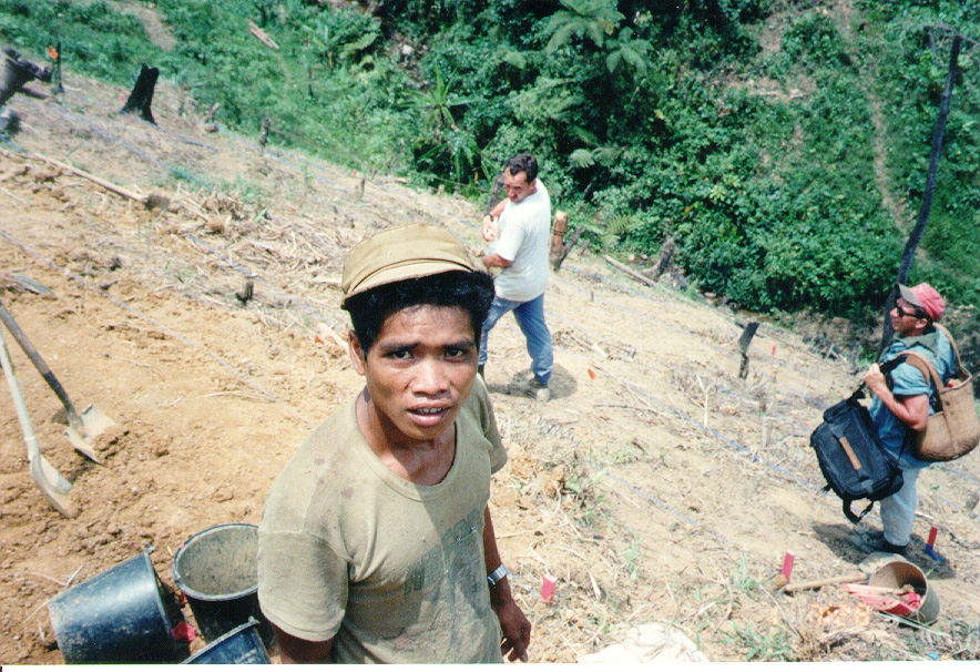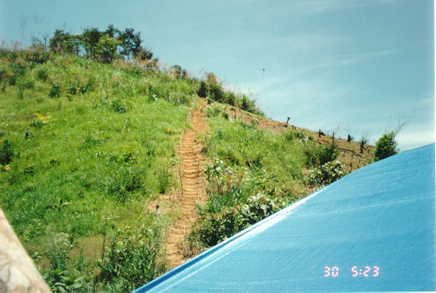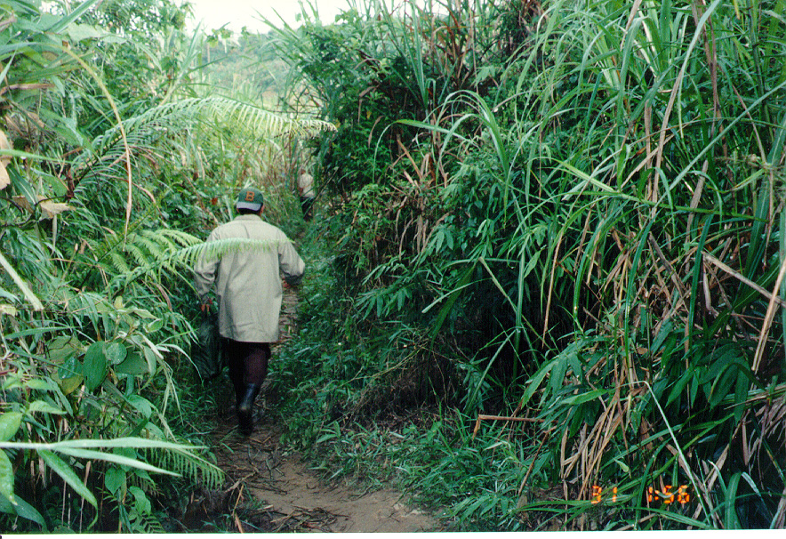 WE BEGAN OUR JOURNEY OUT TO THE SITE WHICH WAS A GOOD TWO MILE WALK FROM THE NEAREST ROAD OR VILLAGE. THE TERRAIN WAS VERY DEEPLY VEGATATED WITH TALL , SHARP GRASS. THE WORKERS WE HAD WITH US HAD TO MAKE THIS TRAIL FOR US.