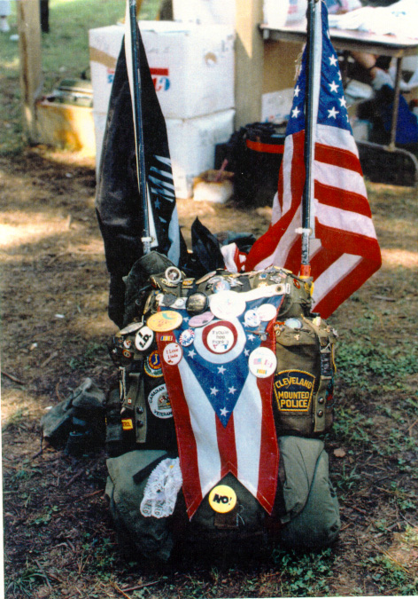Dennis named his 78 pound pack Alice. The two flags extend from Alice, topped by blinking lights. Children and adults anxious to support Wood gave him buttons to put on his pack. Some buttons disappeared, but were replaced with new ones. A boy scout gave him a "No Fear" button, the Canadian Veterans Association and the Cleveland Mounted Police gave him patches. Every button or patch has meaning. They serve as reminders of the outpouring of support Dennis Wood received from every part of the continental United States and Canada.