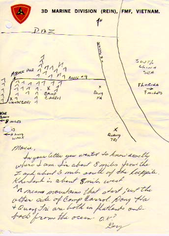 In your letter you wanted to know exactly where I am. I'm about 8 miles from the DMZ and about 3 miles south of the Rock Pile. Khe Sahn is about 8 miles west. ^ means mountains that start just the other side of Camp Carrol. Dong Ha and Quang Tri are both in the flatlands and back from the ocean.