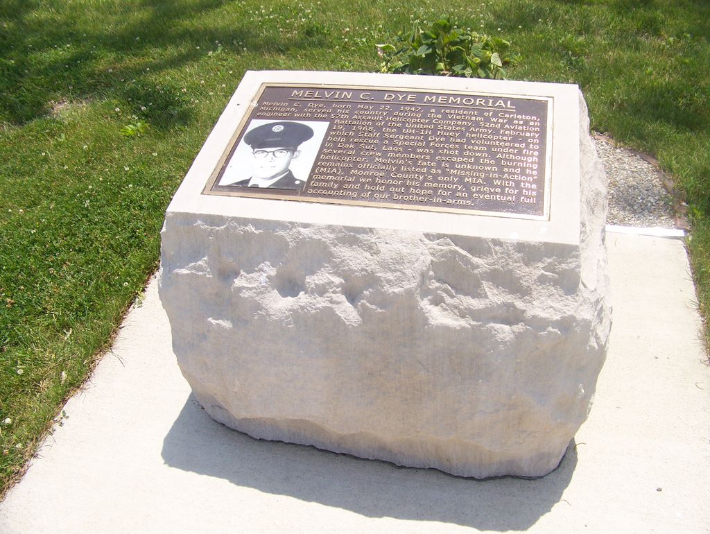 The Melvin C. Dye Memorial was added in the summer of 2006. Melvin Dye was the only soldier from Monroe County to be listed as MIA from the Vietnam War. The plaque describes his military history and gives some of the details of what happened on that fateful day on Feburary 19, 1968 when his Huey helicopter was shot down near Dak Sut, Laos.