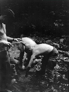 "A mountain stream below the darkness of the jungle canopy. One of the few occasions to wash."