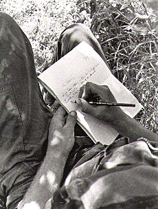 "When we were in one place long enough, we often took the opportunity to write home. I remember reaching over my "slack man's" shoulder to take this picture. It wasn't until many years later, when I made a mural size print from the negative, that I was first able to read what he wrote to his girlfriend."