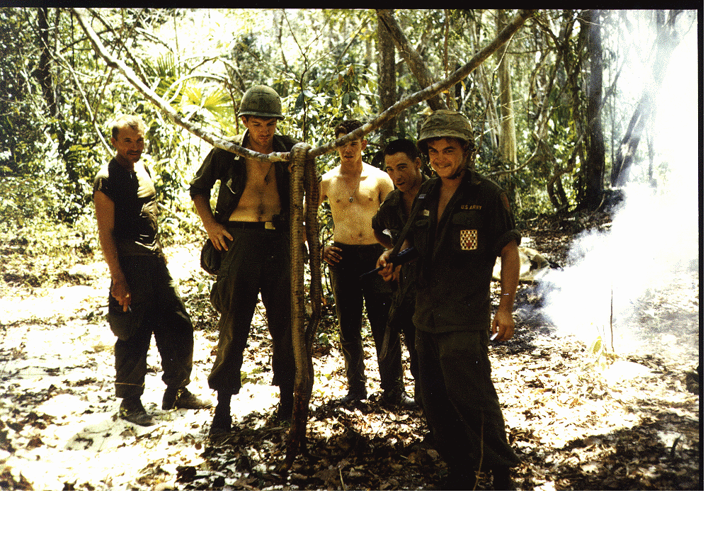 This is a picture of a 13 foot long King Cobra which we killed while on patrol. This cobra wa in a rice cache that we uncovered in an abandoned ville. We suspected that the snake had been put in there to ambush us, but it had been in there for a couple of days, and was not as fast at it could have been. That's me (Buddy) with my hands on my hips.